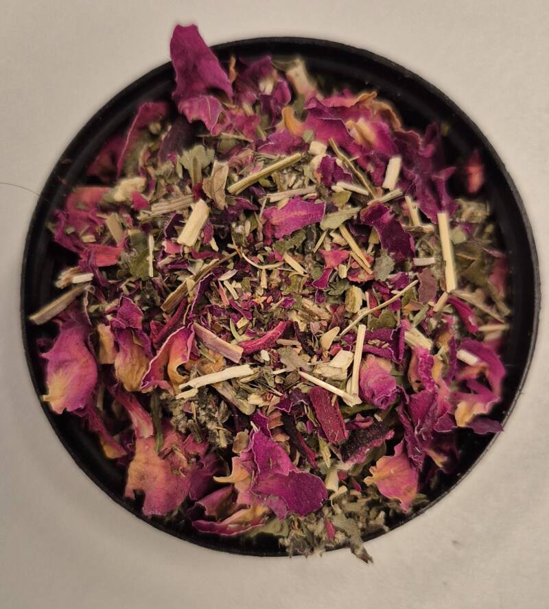 Ingrediënten: Aardbeiblad, Bijvoet, Hibiscus, Rozenblaadjes. (Eventueel aan te vullen naar keus met Appelstukjes, Lindebloesem of kamille)
